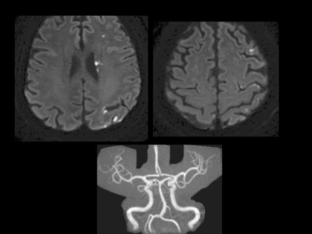 Les deux coupes de l’imagerie de diffusion montrent des hypersignaux punctiformes multiples, tous localisés dans le territoire de l’artère cérébrale moyenne gauche. Il n’y a aucune anomalie visible sur l’ARM cérébrale (ni sténose ni occlusion artérielle, notamment dans le territoire ischémique atteint).