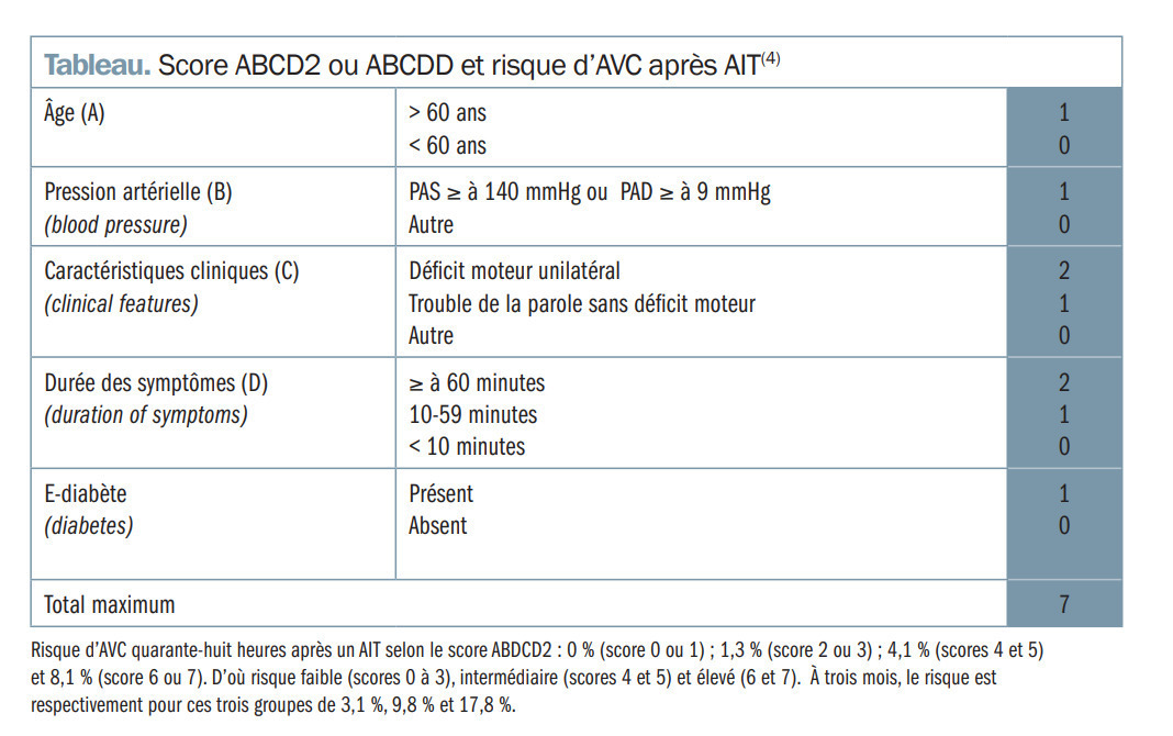 Le score ABCD2 est un outil clinique très utile, permettant d’évaluer le risque de récidive ischémique précoce après un AIT, et donc d’évaluer l’urgence nécessaire à la prise en charge.