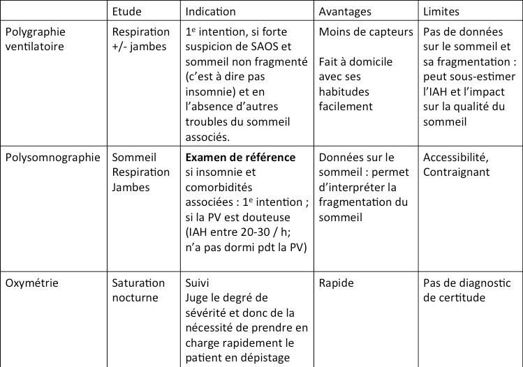 Ci-joint un bref récapitulatif de la polygraphie ventilatoire, polysomnographie et oxymétrie nocturne.
