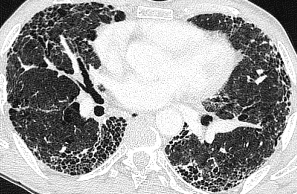 1) de la destruction parenchymateuse : typiquement les microkystes (rayon de miel) qui sont de petits « trous », avec paroi, à prédominance sous-pleural