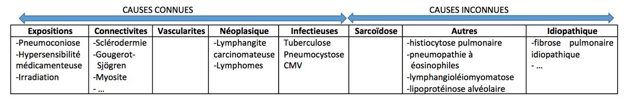Concernant les causes aiguës il vous faudra penser principalement à 4 grandes étiologies : infectieuses, insuffisance cardiaque, syndrome de détresse respiratoire aiguë (SDRA) et à une acutisation d’une pneumopathie interstitielle diffuse (PID) chronique.
