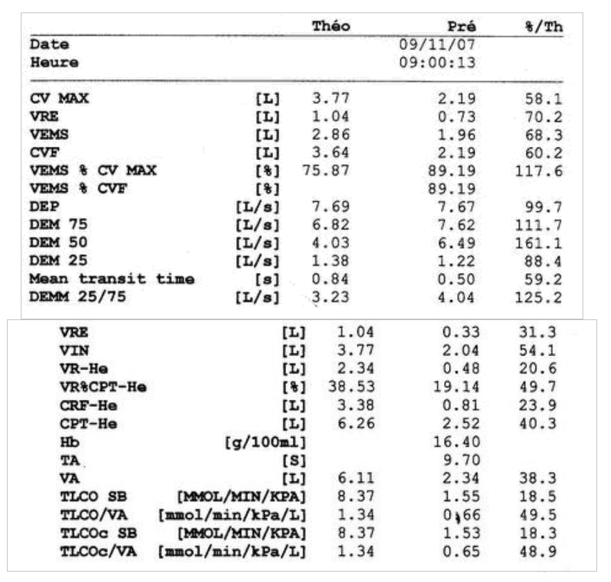Attention à ne pas vous tromper pour la valeur du rapport de Tiffeneau : il faut bien regarder la valeur en % dans la colonne « mesures » et non pas le %théorique qui est un pourcentage d’un pourcentage !!