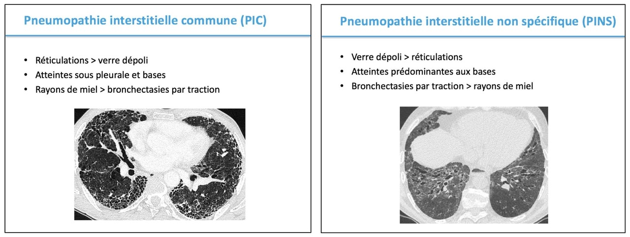Concernant l’origine de la PID, l’on s’orientera ici préférentiellement vers l’asbestose car le scanner montre des images plutôt en faveur de pneumopathie interstitielle commune (PIC) (absence de verre dépoli) et l’alvéolite est neutrophilique ; dans le cadre d’une PID médicamenteuse, l’alvéolite est plutôt lymphocytaire voire éosinophilique et les images plutôt en faveur d’une pneumopathie interstitielle non spécifique (PINS) (verre dépoli+++) et dans la PID de la dermatopolymyosite si l’alvéolite est plutôt neutrophilique ou lymphocytaire, le scanner montre le plus souvent des images de pneumopathie interstitielle non spécifique (PINS) également.