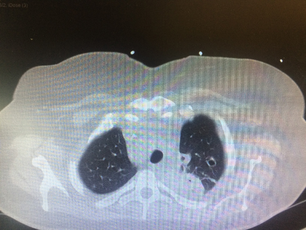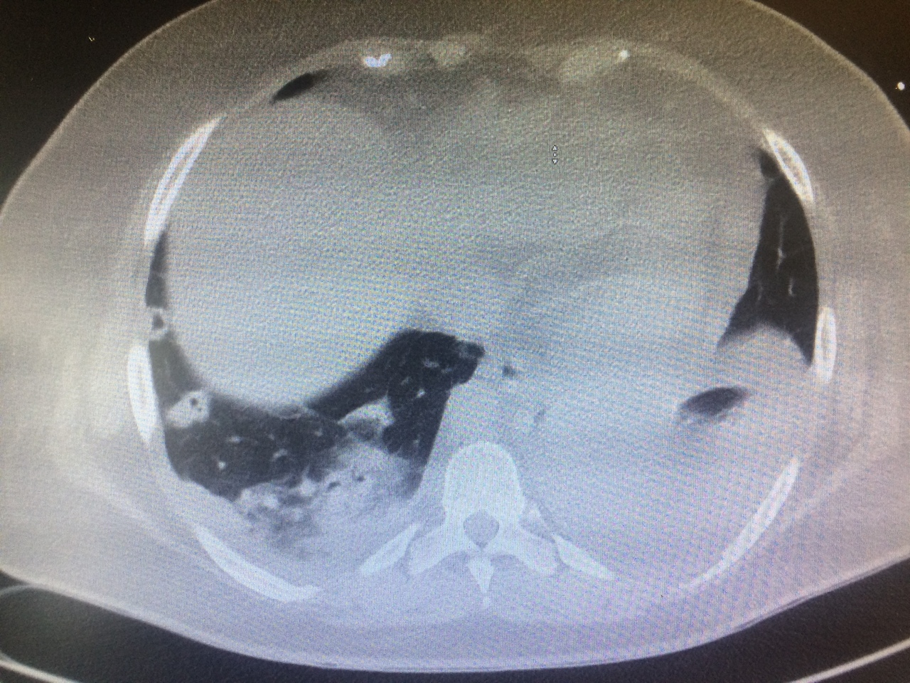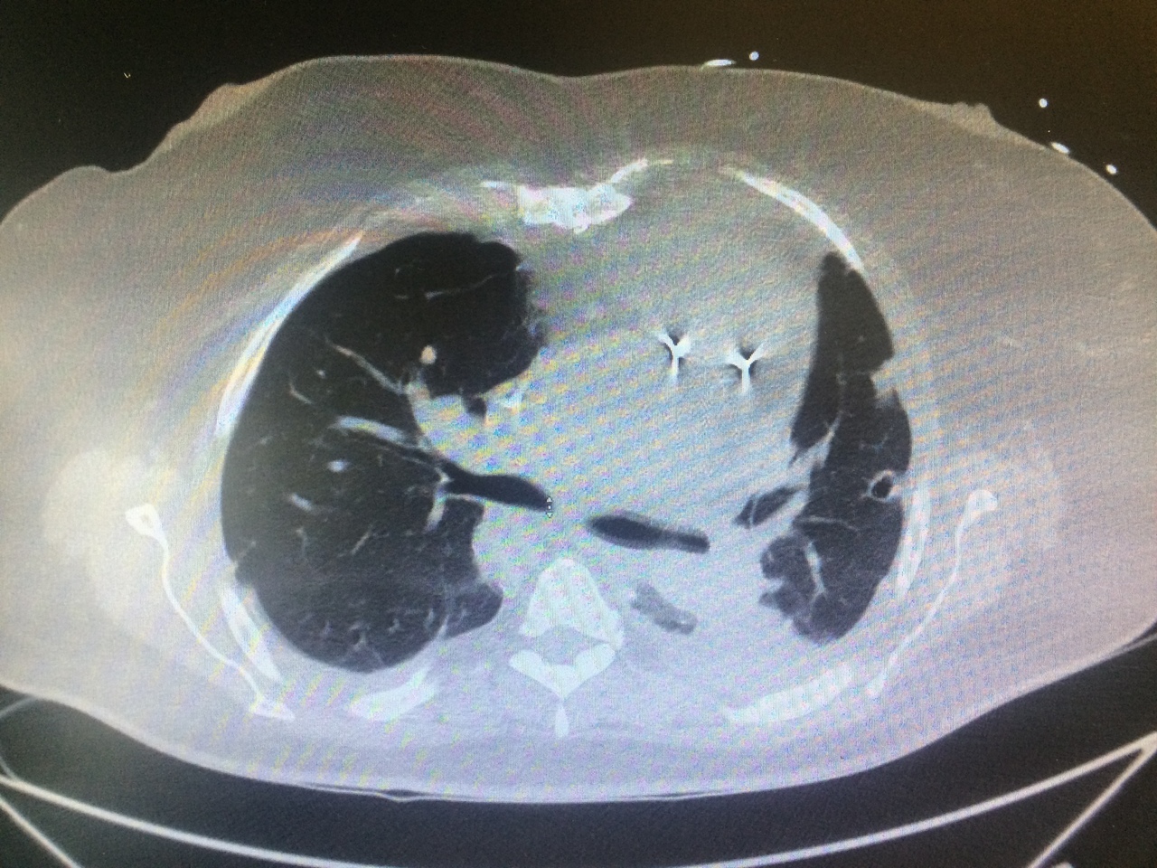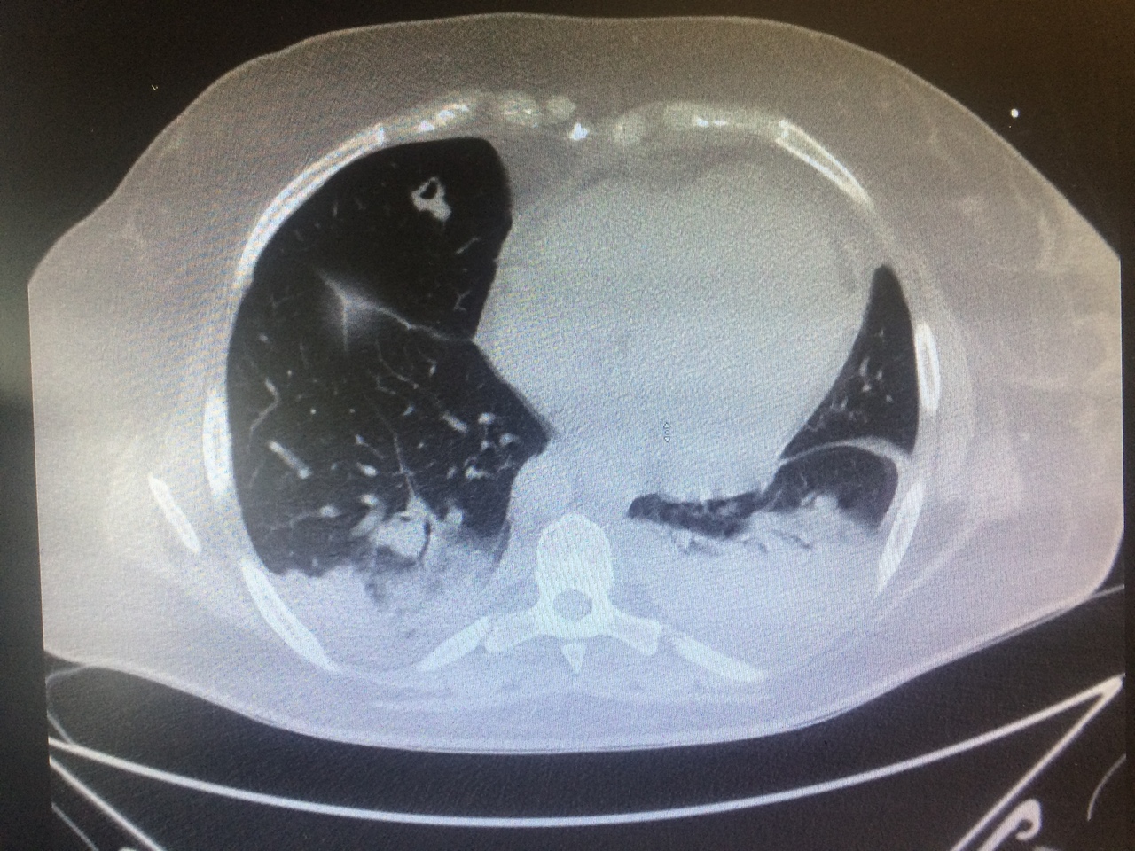 L’échographie cardiaque retrouve une fonction ventriculaire gauche correcte avec une débit cardiaque conservé. Vous ne visualisez pas bien la valve pulmonaire. Le ventricule droit est nettement dilaté mais normo-kinétique. Il n’y a pas d’épanchement péricardique.