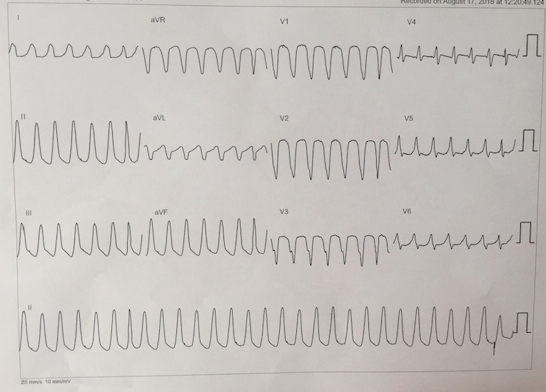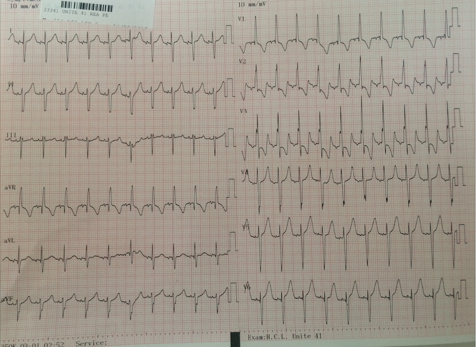 Vous revoyez ce même patient, M. S, à l’âge de 30 ans. Il est pris en charge par le Samu pour une syncope d’une durée de 30 secondes. Vous l’hospitalisez en unité de soins intensifs cardiologiques (USIC). Durant la nuit, M. S récidive : épisode d’une durée de 2 minutes avec une hypotension et une courte perte de connaissance. L’épisode est spontanément résolutif. Voici son électrocardiogramme.