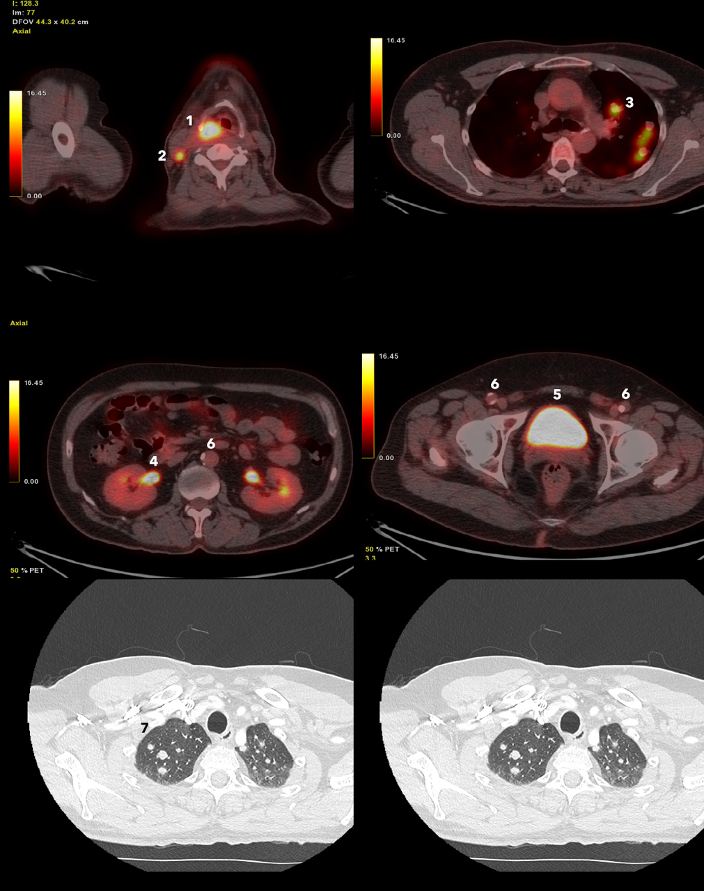 1 : hypermétabolisme pathologique, tumeur de l‘’hypopharynx droit ;