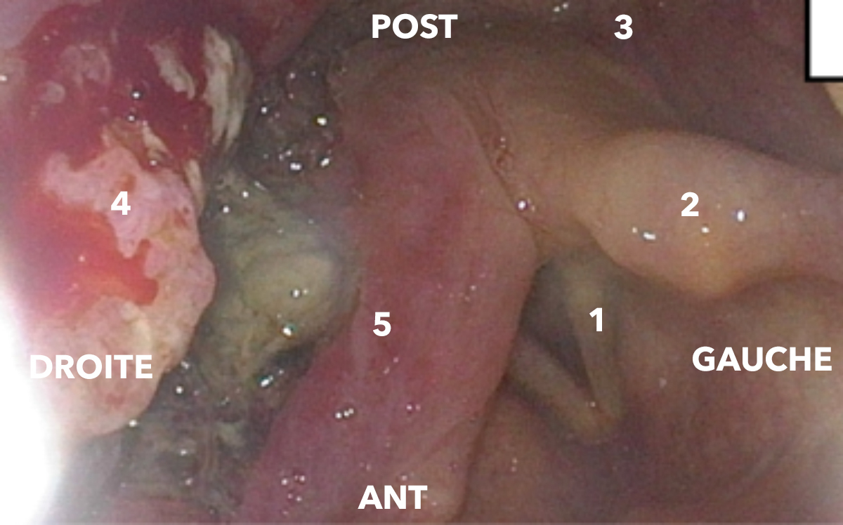 Il appartiendra à l’endoscopiste d’évaluer l’origine de l’obstacle, tumoral, œdème laryngé, corps étranger ou cause mixte.