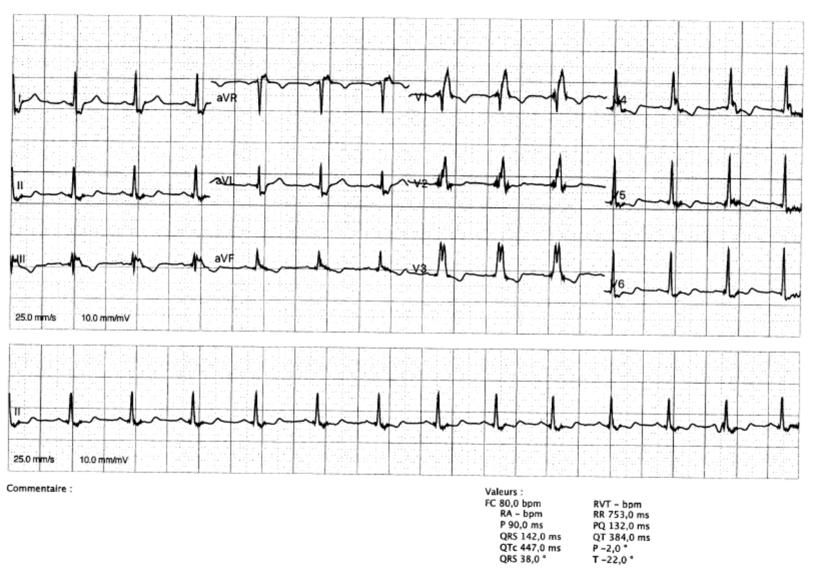 M. B. a pour principaux antécédents une pneumopathie franche lobaire aiguë à pneumocoque en 2012 ayant nécessité un séjour en réanimation, une cardiopathie ischémique avec la pose de deux stents coronaires nus en 2010, une hypertension artérielle et une hypercholestérolémie. Son traitement actuel est le suivant : Kardégic 75 mg 1 cp/j, Valsartan 80 mg 1 cp/j, Hydrochlorothiazide 50 mg1 cp/j, Rosuvastatine 20 mg 1 cp/j, Stilnox 1 cp le soir, Xanax 0,25 mg à la demande. Pas d’allergie médicamenteuse.