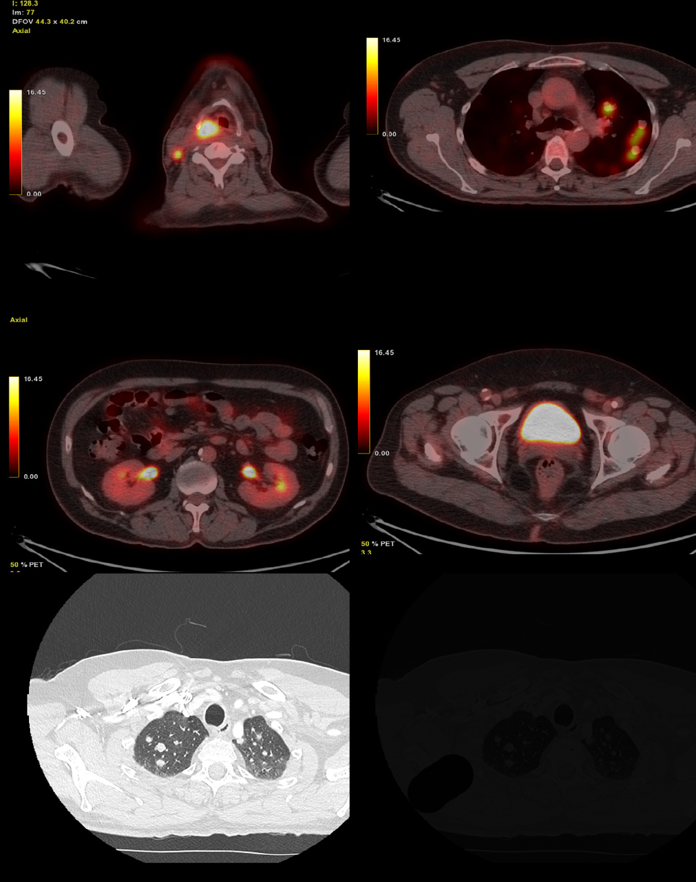 Même remarque que pour l’iconographie précédente. TEP-scan au 18-FDG avec coupes de scanner thoracique en fenêtre parenchymateuse..