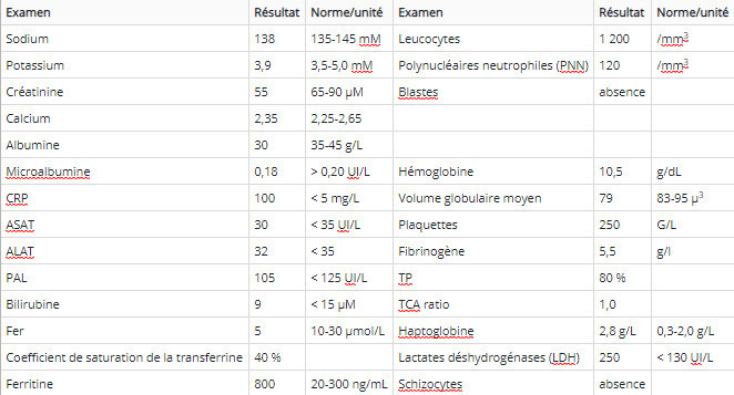 TA = 130/80 mmHg, ; FC = 105 bpm, ; FR = 16/min ; SaO2 = 98% en air ambiant ; T° = 38,7°C.