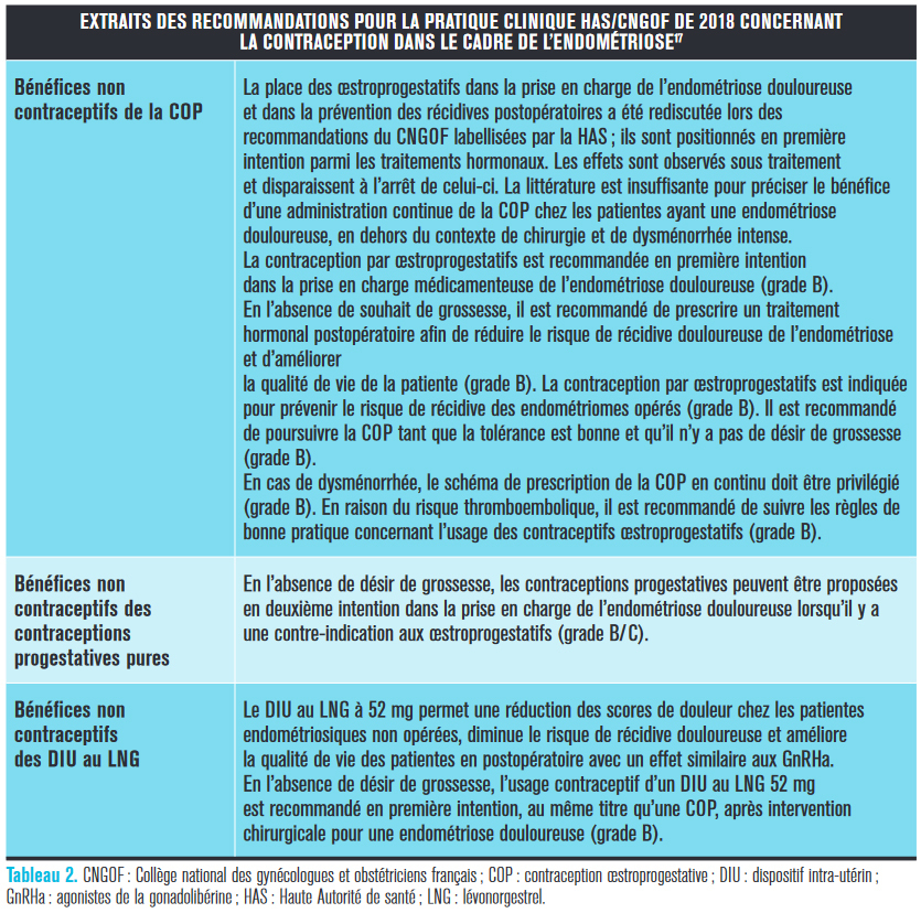 Endométriose : quelle contraception ? Les recommandations sont : D’après : Mais L. L’endométriose digestive. Rev Prat 2022;72(2);193-7.