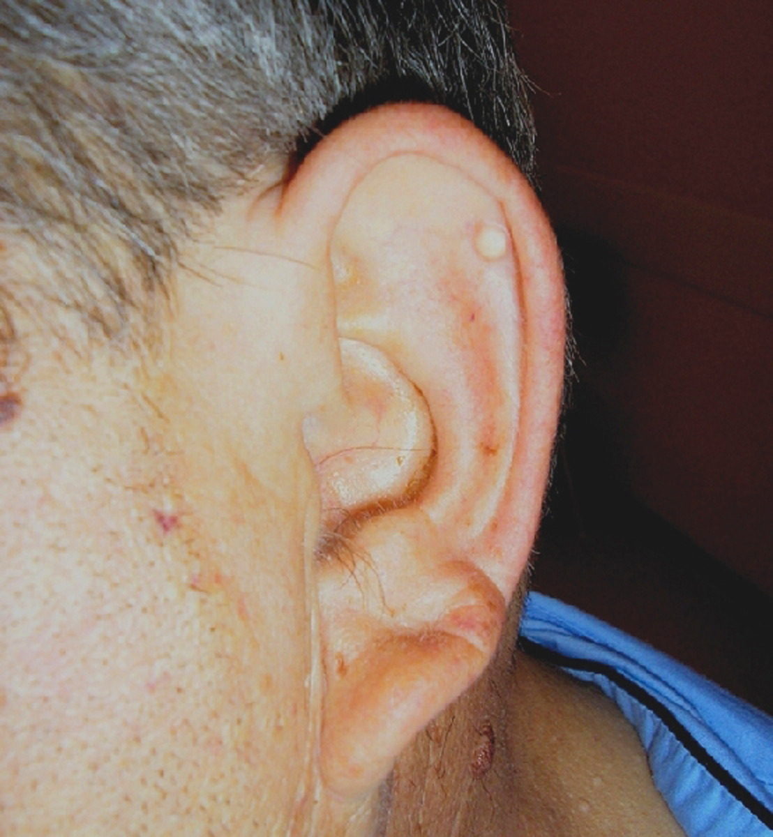 Il s’agit bien d’un tophus du pavillon de l’oreille. Il s’agit de dépôts uratiques visibles sous la peau dans le cadre d'une goutte. Les tophus se localisent autour des articulations atteintes mais aussi dans des sites électifs : pavillon de l'oreille, coudes (bursite olécrânienne), tendons d'Achille, articulations interphalangiennes distales arthrosiques ou pulpe digitale chez les sujets sous diurétiques.