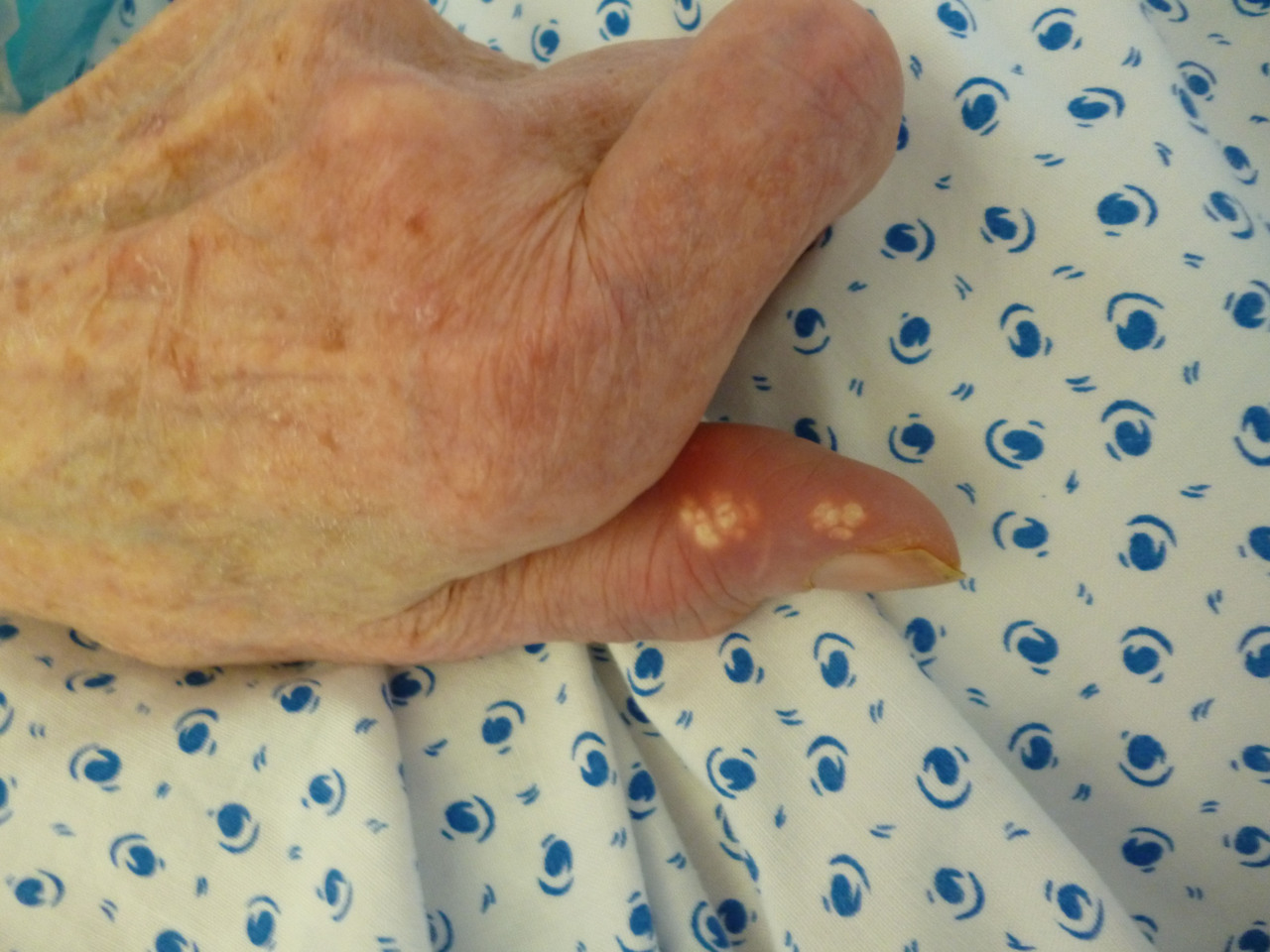 Quel est votre diagnostic? Un CREST syndrome Un tophus Une pustulose exanthématique Un herpès digital Une infection à Mycobacterium marinum OK Il s'agit d'un tophus. Valider mes réponses