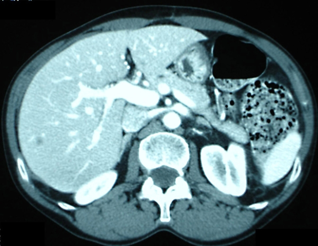 Quel est votre diagnostic ? Un foie normal Un abcès hépatique Une métastase hépatique Un kyste Une cholécystite OK Il s’agit d’une tomodensitométrie hépatique montrant une métastase hépatique unique d’un cancer du côlon. Dans 60 à 80 % des cas, les cancers du côlon ou du rectum se développent sur une lésion préexistante, le polype adénomateux. Valider mes réponses