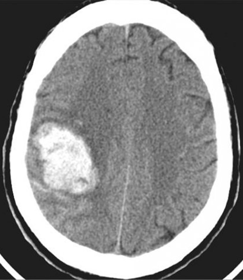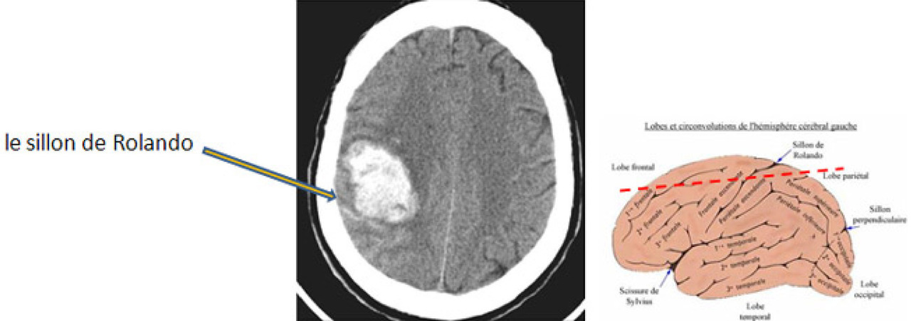 Il s’agit d’un hématome cortical sur une coupe TDM cérébrale sans injection. L’hémorragie apparaît comme une zone spontanément hyperdense. Ici il s’agit d’une hyperdensité spontanée frontale droite. Il s'agit bien d'un hématome frontal car en avant du sillon de Rolando, qui, sur des coupes axiales, souvent obliques, est en général situé assez en arrière sur ces coupes hautes.