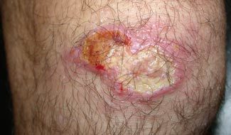 Il s’agit d’une ulcération indolore au retour d’un voyage dans le pourtour méditerranéen qui est une leishmaniose cutanée, ou bouton d’Orient. C’est une des lésions les plus fréquentes des voyageurs. En Amérique du Sud, elles peuvent être très délabrantes si elles sont situées au niveau de la face. Un frottis permet de visualiser les parasites.
