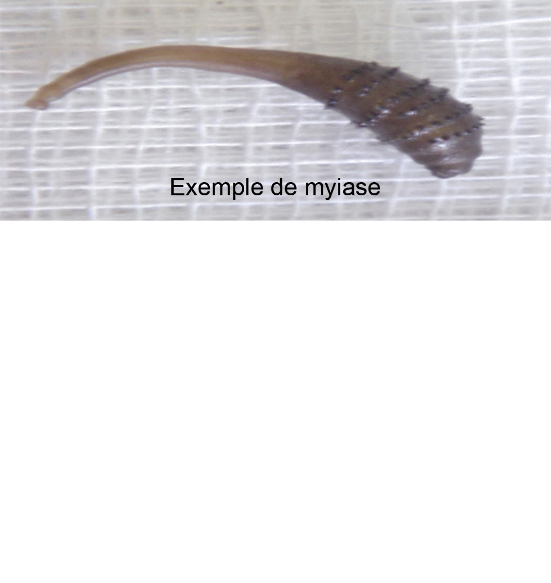 Il s’agit d’une lésion furonculeuse due à une larve de mouche, ou myiase. Le traitement consiste à extraire doucement le parasite.