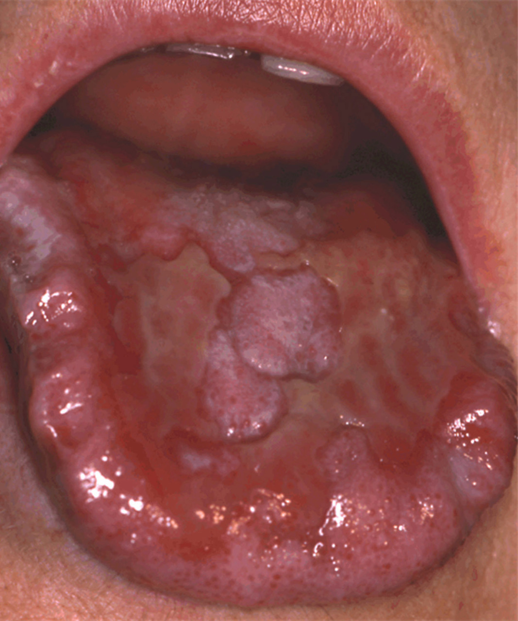 Il s’agit d’un lichen plan érosif. Le lichen plan buccal est une maladie inflammatoire le plus souvent bénigne qui se présente classiquement sous forme de lésions blanches localisées ou diffuses d’aspect réticulé, atteignant le plus fréquemment la partie postéro-inférieure de la face interne de la joue et le dos de la langue, de façon bilatérale et symétrique. Cependant, ces lésions blanches se présentent également sous forme papuleuse, verruqueuse ou en plaques, et peuvent s’y associer des plages érosives ou atrophiques. Les formes érosives et atrophiques ont un risque de dégénérescence.