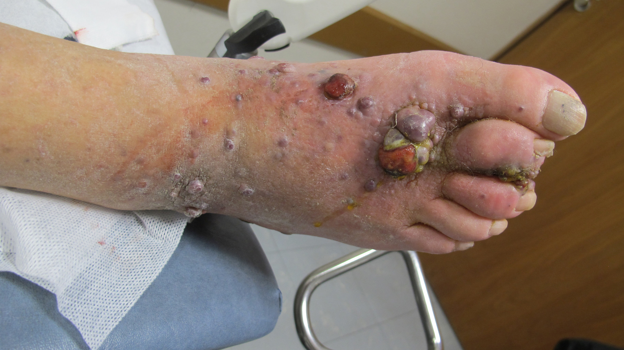 Il s'agit d'une maladie de Kaposi classique avec atteinte du membre inférieur. Présence de nodules saignotants, d'un lymphœdème et de multiples papules violines. La maladie de Kaposi classique correspond à la description initiale de la maladie et est caractérisée par la survenue de papules et de nodules violines prédominant aux membres inférieurs, s'associant à un lymphœdème atteignant préférentiellement les sujets âgés de sexe masculin avec un sex-ratio d'environ 10 hommes pour 1 femme. Il s'agit le plus souvent d'une maladie indolente d'évolution lente, ne nécessitant que rarement le recours à un traitement spécifique. Pour en savoir plus : Dupin N, Deleuze J. Maladie de Kaposi et virus HHV8 : un modèle de cancer cutané de l'immunodéprimé. Rev Prat 2014;64(3):311-6.