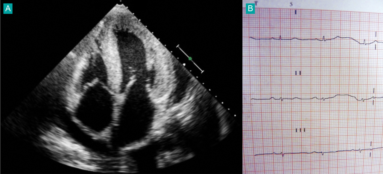 Il s'agit d'une amylose cardiaque, échographie (A) et ECG (B). Association cardiopathie hypertrophique et microvoltage très évocatrice du diagnostic. En France, le nombre de nouveaux cas d'amylose AL est de l'ordre de 500 par an. Environ 60 % des patients ont une atteinte cardiaque au moment du diagnostic. Elle constitue le facteur pronostique majeur. Il s'agit d'une cardiomyopathie hypertrophique restrictive, se manifestant initialement par une asthénie et une dyspnée croissante. Pour en savoir plus : Jaccard A, Bridoux F. Amylose. Rev Prat 2014;64(4):575-81.