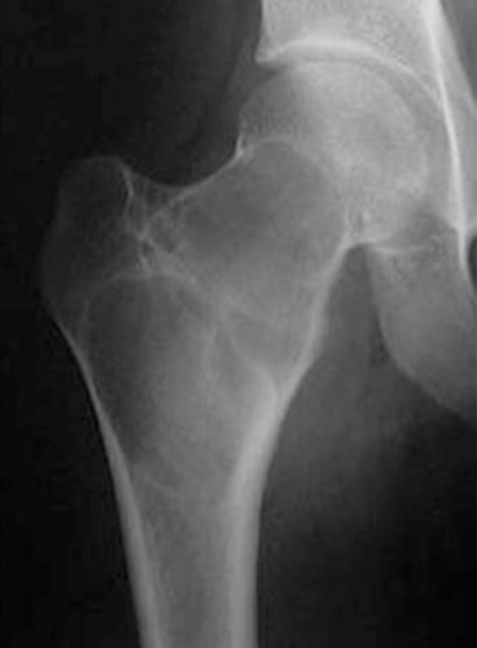 Il s'agit d'un processus lytique au sein de la métaphyse fémorale supérieure. La lyse est cernée d'une sclérose périphérique régulière. Elle contient quelques travées qui sont régulières et respectées. L'ensemble dessinant un "contour géographique". Les corticales sont discrètement déformées et amincies, mais également de façon régulière, sans effraction. Il n'y a pas de réaction périostée. Il n'y a pas d'expansion apparente dans les parties molles. Cet aspect radiologique est calme, traduisant plutôt une tumeur bénigne. Ce processus est lent. Il reste donc régulier, souvent cerné d'une bande de sclérose qui est une construction réactionnelle de l'organisation, mais qui dans ce cas est bien limitée et respectée.