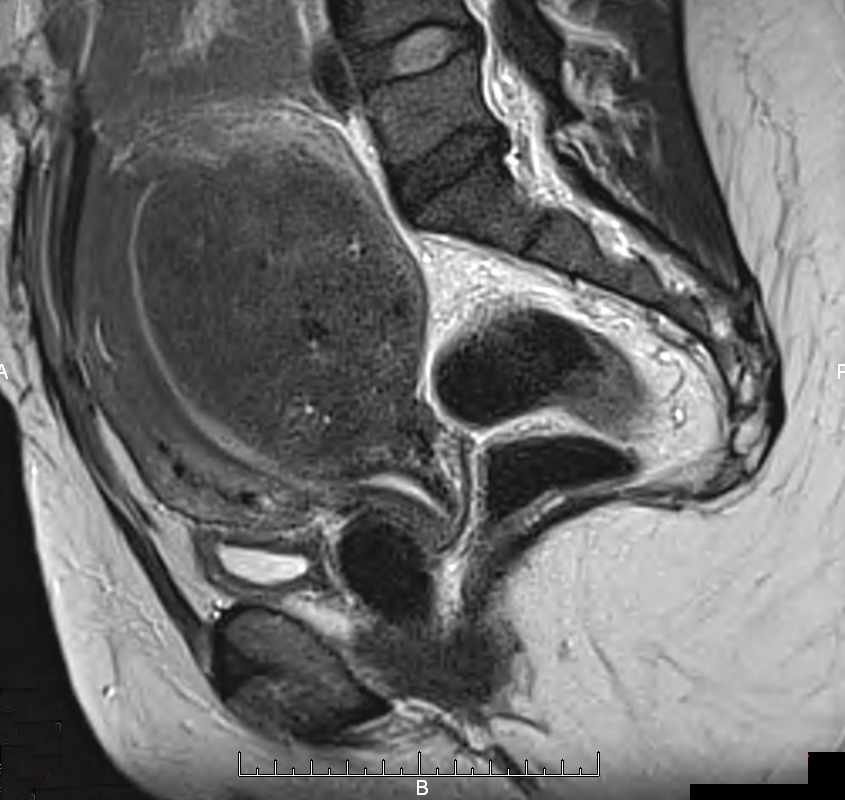 Il s'agit d'une adénomyose diffuse corporéale postérieure. Épaississement de la zone jonctionnelle transversale. Imagerie pelvienne par résonance magnétique, coupe sagittale en séquence T2. Sur le plan clinique, l'adénomyose est souvent asymptomatique. Chez les femmes symptomatiques, les ménorragies, présentes dans 50 % des cas, sont le symptôme le plus fréquent, mais leur incidence n'est pas corrélée à la profondeur de l'envahissement du myomètre. L'IRM permet de distinguer l'adénomyose sous-endométriale, l'adénomyose focale, appelée aussi adénomyome, et l'adénomyose diffuse. Mais la référence pour le diagnostic d'adénomyose est l'examen anatomo-pathologique.