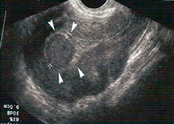 Il s'agit d'un fibrome utérin sous-muqueux. L'examen gynécologique par le toucher vaginal et le palper abdominal recherche une augmentation du volume de l'utérus dont les contours sont déformés par le ou les fibromes et/ou une masse latéro-utérine mobile avec l'utérus. L'échographie confirme le diagnostic en visualisant une masse bien limitée iso- ou hypo-échogène sans renforcement distal et développée aux dépens de l'utérus.