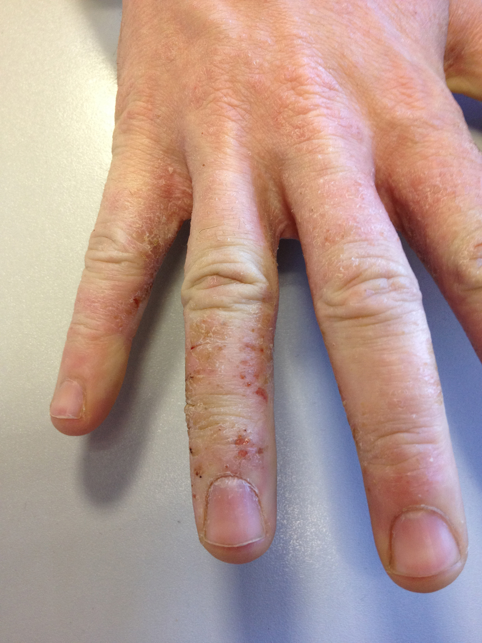 Il s'agit d'un eczéma allergique de contact, ou dermatite allergique de contact, dans ce cas au chrome du ciment. La dermatite allergique de contact est une hypersensibilité retardée à médiation cellulaire. Les 2 grandes sources d'allergie au chrome sont le ciment, responsable d'une dermatose professionnelle (mains) et le contact avec des objets en cuir tannés avec du chrome, particulièrement les chaussures. Le traitement de l'eczéma repose sur les dermocorticoïdes. Le traitement préventif repose sur l'éviction des contacts avec l'allergène, dans ce cas le chrome.