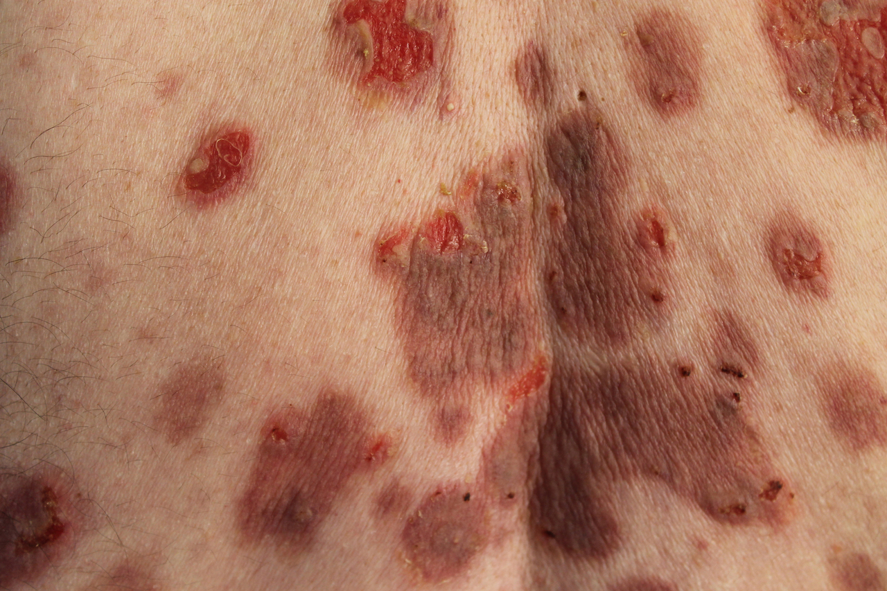 Il s'agit de l'aspect clinique d'un pemphigus : lésions érosives post-bulleuses avec collerette épidermique. L'atteinte cutanée d'un pemphigus profond (ou vulgaire) est caractérisée par des bulles flasques rarement visibles, laissant place à des érosions douloureuses avec collerette desquamative sur peau saine. Les dermatoses bulleuses auto-immunes sont de loin les dermatoses bulleuses les plus fréquentes de l'adulte : au premier rang, la pemphigoïde bulleuse et le pemphigus profond. Pour en savoir plus : Droitcourt C, Le Gall F, Dupuy A. Dermatose bulleuse. Rev Prat 2015;65(2):275-85.