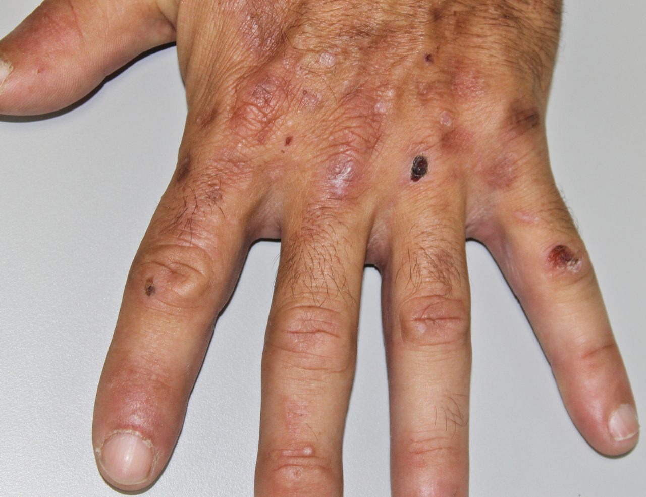 Il s'agit de l'aspect clinique d'une porphyrie cutanée tardive : bulles, grains de milium, fragilité cutanée. La porphyrie cutanée tardive est la plus fréquente des porphyries, caractérisées par un trouble métabolique survenant dans la biosynthèse de l'hème. Cliniquement, on note des bulles sur les zones découvertes d'évolution cicatricielle (grains de milium), une hyperpilosité et une hyperpigmentation des zones malaires, une fragilité cutanée. Le diagnostic est confirmé par un taux élevé d'uroporphyrine dans les urines.