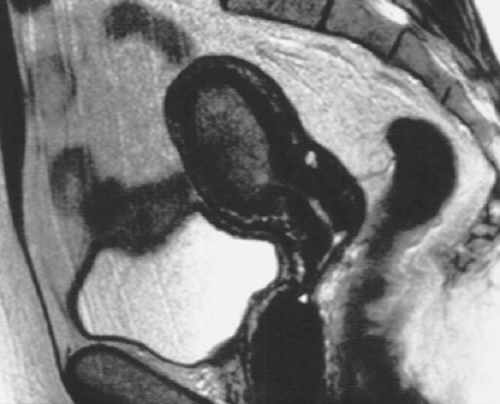 Il s'agit d'une IRM pelvienne révélant un cancer de l'endomètre. Le cancer de l'endomètre est le cancer gynécologique pelvien le plus fréquent en France. Il est suspecté devant des métrorragies post-ménopausiques qui doivent faire l'objet d'un bilan étiologique. Le pronostic favorable des stades localisés (survie relative à 5 ans = 95 %) renforce la nécessité d'un diagnostic précoce. Contrairement au cancer du col de l'utérus, il n'existe pas de dépistage du cancer de l'endomètre. L'IRM pelvienne associée à une exploration des aires ganglionnaires lombo-aortiques est l'examen de référence. Cette IRM doit évaluer 5 paramètres : le volume tumoral, le degré d'infiltration myométriale, la présence d'adénopathies iliaques ou lomboaortiques, l'atteinte éventuelle du col ou des organes de voisinage.