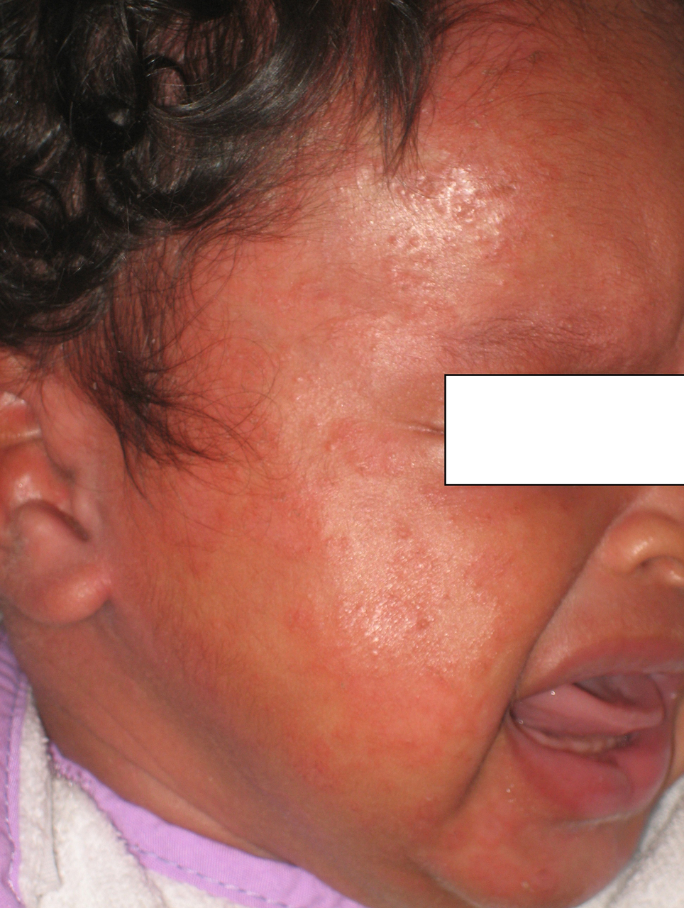 Il s'agit de l'aspect clinique d'une dermatite atopique du nourrisson. Les signes apparaissent en général au cours du deuxième ou du troisième mois, sous forme de lésions eczématiformes prurigineuses des joues avec respect de la zone médio-faciale. Le prurit est intense et insomniant. Il existe une atteinte des convexités des membres, tandis que la zone sous la couche est en général respectée. À la phase aiguë, les lésions sont érythémateuses, suintantes, puis croûteuses. Dans 20 à 30 % des cas, les lésions vont disparaître à la fin de la deuxième année de vie.