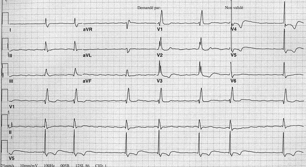 Quel est votre diagnostic ? Hypertrophie ventriculaire gauche Séquelle d'infarctus du myocarde Trouble de la repolarisation Flutter auriculaire Fibrillation auriculaire à grosses mailles Il s'agit d'une fibrillation auriculaire à grosses mailles associée à un bloc de branche droit.Pour en savoir plus : Tassin A, Furber A. Fibrillation auriculaire. Rev Prat 2013;63(3):403-10. OK Valider mes réponses
