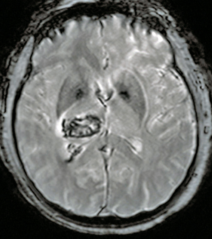 Il s'agit d'un hématome intracérébral thalamique droit en IRM séquence T2*. L'hématome intracérébral est une collection de sang consécutive à la rupture d'un vaisseau intracrânien. L'hypertension artérielle est la première cause et l'hémorragie est alors très souvent localisée au niveau des noyaux gris centraux. La deuxième cause est la rupture d'une malformation vasculaire, que ce soit une malformation artérioveineuse, un anévrisme ou un cavernome. Parmi les autres causes, on cite la thrombophlébite cérébrale, les troubles de la coagulation et l'angiopathie amyloïde. Le scanner cérébral, qui est l'examen de référence en cas d'hémorragie cérébrale, met en évidence une plage en hyperdensité et est le plus souvent complété d'un scanner cérébral avec injection et d'un angioscanner cérébral à visée étiologique (recherche de tumeur, de malformation vasculaire, de thrombose veineuse cérébrale). L'IRM cérébrale avec ARM peut être intéressante lorsque le scanner n'est pas contributif pour rechercher une cause de l'hémorragie.
