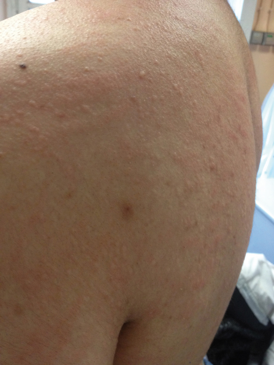 Il s'agit de l'aspect clinique d'une urticaire cholinergique. C'est un tableau clinique stéréotypé survenant lors d'un effort physique avec classiquement un semis de petites papules survenant en général sur le torse. D'autres circonstances telles qu'un bain chaud ou un stress peuvent déclencher le même type de manifestations. L'urticaire cholinergique est à distinguer de l'anaphylaxie à l'effort induite par un aliment ou un médicament. Pour en savoir plus : Amsler E, Aractingi S, Soria A. Hypersensibilités et allergies. Rev Prat 2015;65(1):121-38.