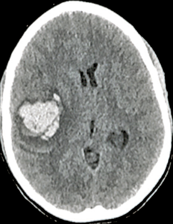 Il s'agit d'un hématome intracérébral frontal droit au scanner sans injection. L'hématome intracérébral est une collection de sang consécutive à la rupture d'un vaisseau intracrânien. L'hypertension artérielle est la première cause et l'hémorragie est alors très souvent localisée au niveau des noyaux gris centraux. La deuxième cause est la rupture d'une malformation vasculaire, que ce soit une malformation artérioveineuse, un anévrisme ou un cavernome. Parmi les autres causes, on cite la thrombophlébite cérébrale, les troubles de la coagulation et l'angiopathie amyloïde. Le scanner cérébral, qui est l'examen de référence en cas d'hémorragie cérébrale, met en évidence une plage en hyperdensité et est le plus souvent complété d'un scanner cérébral avec injection et d'un angioscanner cérébral à visée étiologique (recherche de tumeur, de malformation vasculaire, de thrombose veineuse cérébrale). L'IRM cérébrale avec ARM peut être intéressante lorsque le scanner n'est pas contributif pour rechercher une cause de l'hémorragie. Pour en savoir plus : Quenardelle V, Wolff V. Déficit neurologique récent. Rev Prat 2015;65(1):103-10.