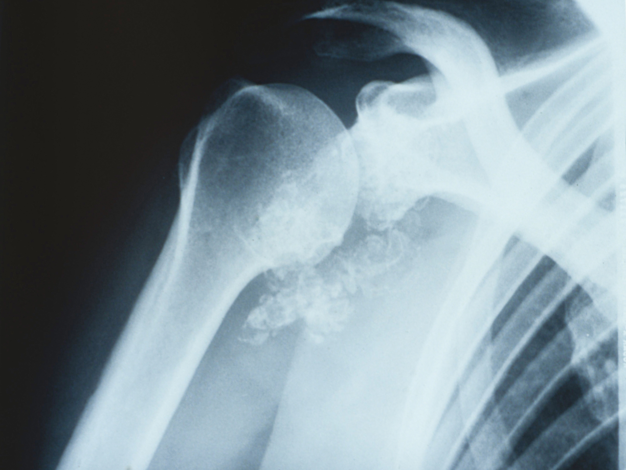 Il s'agit de l'aspect radiographique d'une chondromatose synoviale. La chondromatose synoviale est une métaplasie chondroïde, rare, de la membrane synoviale d'étiologie inconnue. Elle se caractérise par la formation de petits corps cartilagineux (chondromes) ou ostéocartilagineux dans les articulations, les bourses séreuses ou la gaine synoviale, qui, en se détachant, constituent des corps étrangers intra-articulaires. La gêne douloureuse est plus ou moins importante, les localisations préférentielles sont le genou, la hanche, le coude ou l'épaule. Le début est insidieux et peu invalidant expliquant le retard thérapeutique. L'évolution spontanée se fait vers l'arthrose, d'où l'intérêt d'intervenir avant que des lésions importantes ne s'installent mettant en péril l'articulation. Pour en savoir plus : - Bouhaouala MH, Saïd W, Haj Salah M, Bouaziz N, Mourali S, Chaabane S. La chondromatose synoviale isolée de la bourse sous acromiodeltoïdienne : un nouveau cas et revue de la littérature. J Radiol 2006;87(1):65-8. - Dictionnaire de l'Académie de médecine.