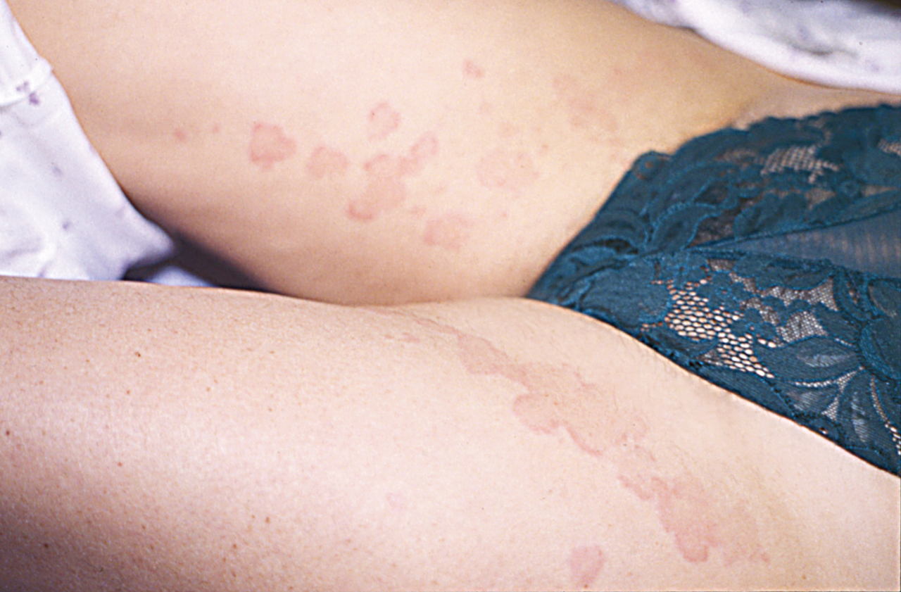 Il s'agit de l'aspect clinique d'une urticaire superficielle (plaques d'urticaire) constituée de papules prurigineuses mobiles et fugaces. Le diagnostic d'une urticaire repose sur l'interrogatoire et l'examen clinique. Ces lésions d'urticaire superficielle sont typiquement décrites comme des lésions ortiées par référence aux urticaires survenant au contact de l'ortie. Les papules d'urticaire peuvent être d'aspect variable, se présentant comme de petites plaques punctiformes ou comme de grandes plaques confluentes. Il y a parfois des plaques en anneau ou en forme d'arc (annulaires ou arciformes) comme ici. Alors que le prurit est féroce, il n'y a en général pas de lésions de grattage. Il ne faut pas hésiter en cas de doute diagnostique à dessiner la périphérie des lésions et à revoir le malade à 24 heures pour confirmer le caractère mobile et fugace de l'éruption. Pour en savoir plus : - Amsler E, Aractingi S, Soria A. Hypersensibilités et allergies. Rev Prat 2015;65(1):121-38.