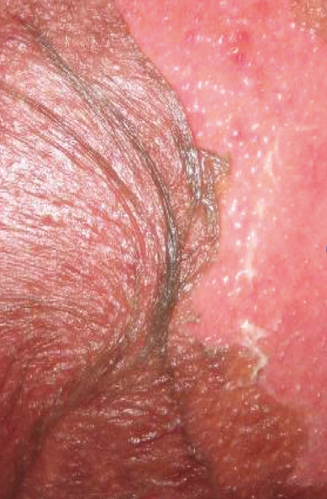 Il s'agit de l'aspect clinique d'une nécrolyse épidermique toxique avec décollement cutané, signe de Nikolsky. Les toxidermies sont des réactions d'hypersensibilité retardée aux médicaments. Leur présentation clinique et leur sévérité sont très diverses, allant des exanthèmes médicamenteux fréquents et bénins aux toxidermies rares mais sévères, touchant les organes profonds dans le cas du DRESS syndrome, ou aboutissant à un décollement cutané dans la nécrolyse épidermique toxique. Les diagnostics différentiels principaux sont les infections, en particulier virales, qui peuvent donner des tableaux cliniques identiques à ceux induits par les médicaments. Dans le but d'améliorer la prise en charge des toxidermies sévères, une organisation en réseau de soins a été préconisée par la HAS. Ainsi un centre de référence national des dermatoses bulleuses immunologiques et toxiques a été labellisé à l'hôpital Henri-Mondor (Créteil) en 2005 et 7 centres de compétence régionaux ont été créés en 2009. Pour en savoir plus :- Bensaïd B, Valeyrie-Allanore L, Lebrun-Vignes B, Nicolas JF. Exanthèmes médicamenteux et toxidermies sévères. Rev Prat 2015;65(7):981-5.