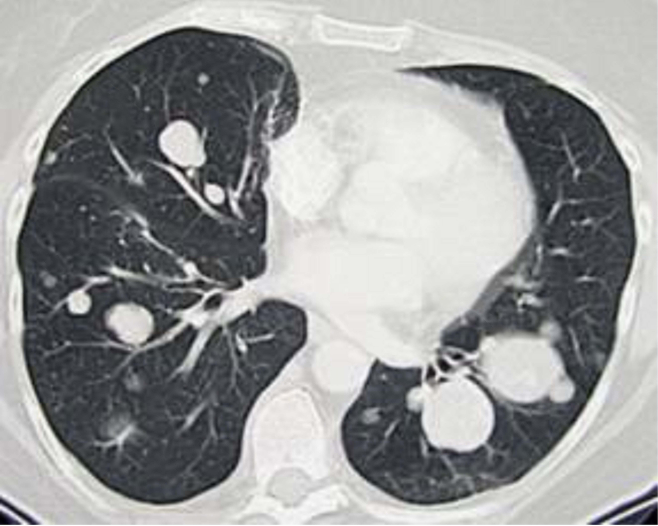 Il s'agit de l'aspect tomodensitométrique de métastases pulmonaires multiples en lâcher de ballons. Il s'agit ici de métastases multiples d'un sarcome des parties molles, traité par chimiothérapie. Si plus de 80 % des lésions cancéreuses ont des bords spiculés, près de 30 % des lésions infectieuses ont des limites floues. De même, des contours nets et bien délimités caractérisent généralement les lésions bénignes (80 % des cas), mais sont observés aussi en cas de lésion sarcomateuse, primitive ou métastatique comme ici.