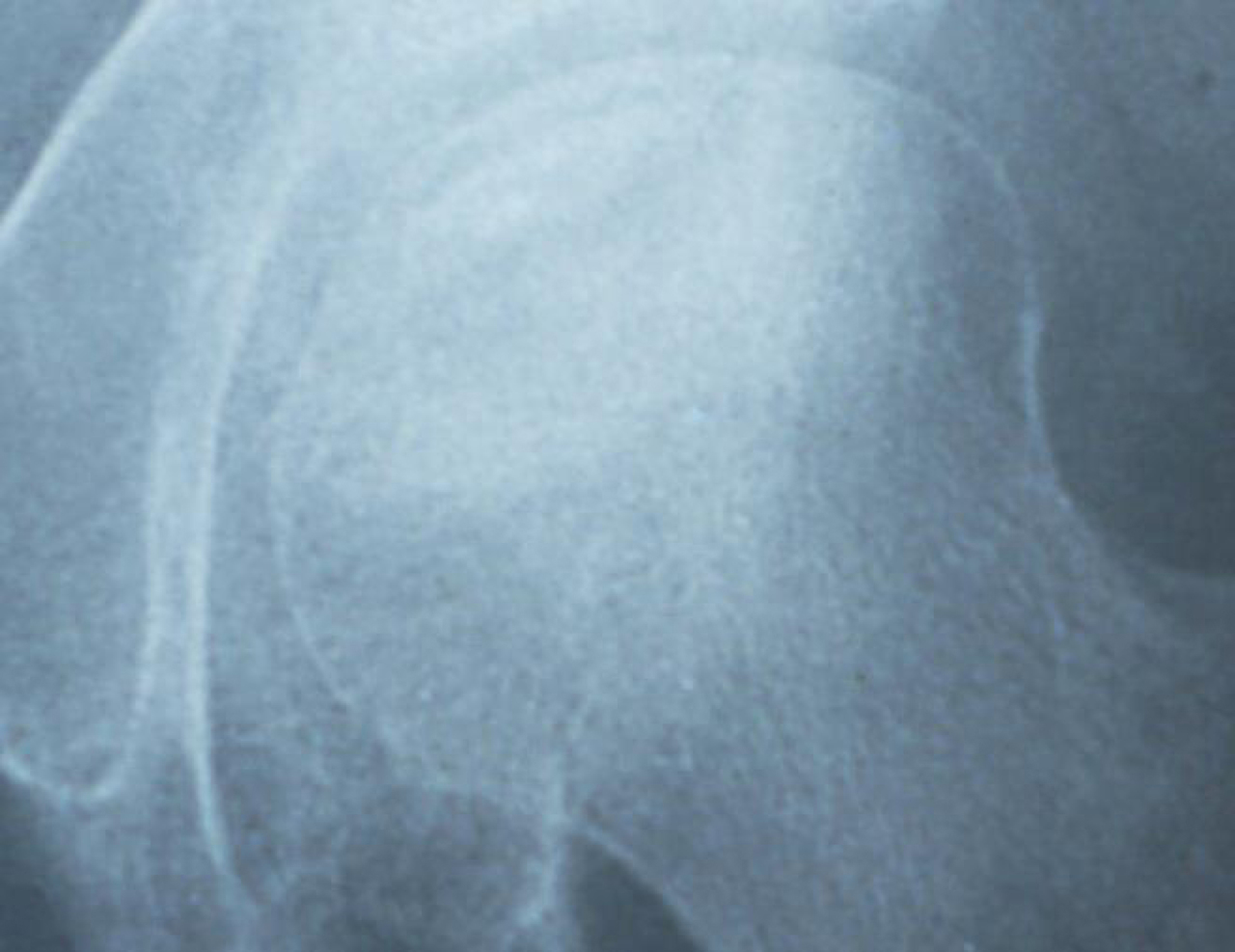 Il s'agit de l'aspect radiologique d'une ostéonécrose de la tête fémorale, ici d'origine cortisonique. L'ostéonécrose de la tête fémorale est la plus fréquente et la plus sévère des ostéonécroses aseptiques. Les autres principales localisations sont les épiphyses humérales, les condyles fémoraux et les métaphyses des os longs. L'évolution redoutée est une déformation de la tête fémorale et une coxarthrose secondaire, aboutissant à un handicap fonctionnel et éventuellement à la nécessité d'une prothèse totale de hanche chez des sujets relativement jeunes et encore actifs. Le risque d'ostéonécrose cortisonique est lié à la dose maximale utilisée minime en deçà de 0,5 mg/kg d'équivalent prednisone (risque d'ostéonécrose cortisonique si corticothérapie en cours ou passée supérieure ou égale à 0,5 mg/kg). Des ostéonécroses aseptiques peuvent survenir, même après une corticothérapie brève (quelques jours) mais à dose élevée. Les ostéonécroses aseptiques cortico-induites sont généralement multiples et étendues, et donc de mauvais pronostic. Un terrain génétique particulier pourrait expliquer la susceptibilité de certains individus, mais probablement l'association d'autres facteurs de risque (prise concomitante d'alcool, dyslipidémie) favorise cette complication. Pour en savoir plus : - Lafforgue P. Ostéonécrose aseptique de la tête fémorale. Rev Prat 2006;56(8):817-25. - Fain O. Prescription et surveillance des anti-inflammatoires stéroïdiens et non stéroïdiens. Rev Prat 2009;59(4):559-72.