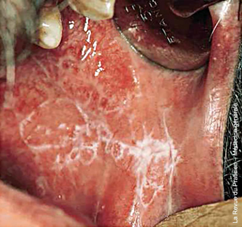 Il s'agit de l'aspect leucoplasique du lichen plan. Il impose la plus grande prudence surtout s'il est atrophique, s'accompagnant d'un placard érythémateux irrégulier et/ou parsemé de ponctuations grisâtres adhérentes, fines et serrées. De même, l'aspect érythroplasique de la muqueuse doit inciter à la vigilance car l'incidence des lésions précancéreuses (dysplasie, carcinome in situ) est alors beaucoup plus importante qu'en cas de simple leucoplasie. Le lichen plan est une maladie cutanéo-muqueuse inflammatoire chronique caractérisée par des troubles de la kératinisation. Ses aspects cliniques sont variés. Les atteintes buccales s'accompagnent volontiers de lésions cutanées ou touchent d'autres muqueuses malpighiennes. La localisation buccale isolée ne concerne que 25 % des patients. L'étiopathogénie est mal connue. L'hypothèse d'un mécanisme dysimmunitaire semble être la plus pertinente. Les lichens induits ou réactions lichénoïdes sont des lésions cliniquement et/ou histologiquement similaires, mais leur étiologie est connue et leur évolution différente.