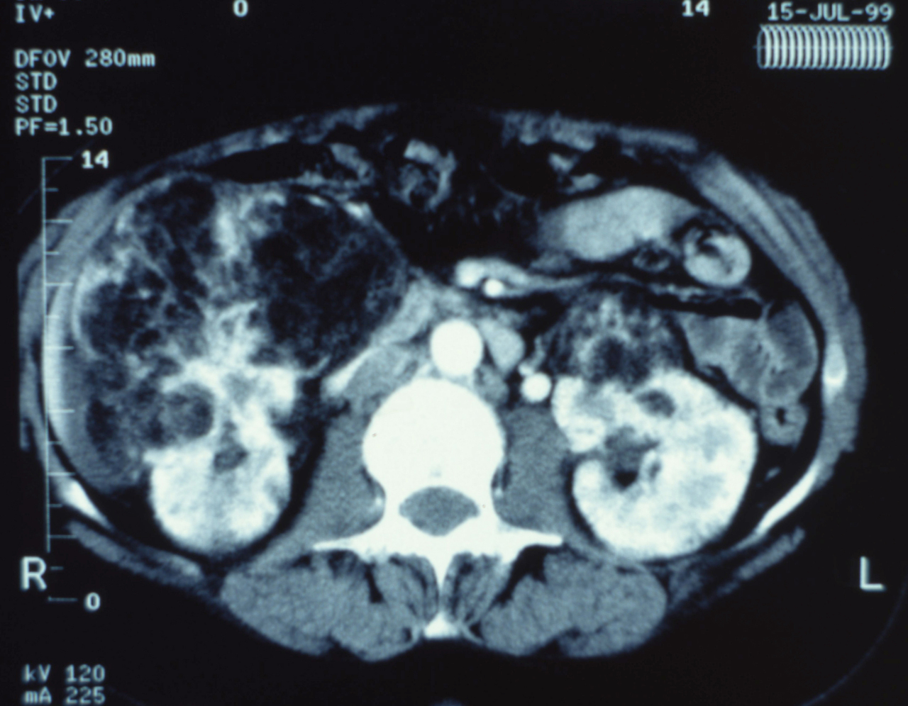 Il s'agit de l'aspect radiologique d'un angiomyolipome du rein droit. Il s'agit d'une tumeur bénigne, qui présente trois composantes différentes : musculaire, vasculaire et graisseuse, dont la distribution est variable. L'angiomyolipome se présente le plus souvent comme une tumeur unique, volumineuse, asymptomatique, découverte à la cinquième décennie chez la femme et survenant dans la majorité des cas en dehors de tout contexte de phacomatose (dans la sclérose tubéreuse de Bourneville il existe une atteinte rénale bilatérale et multiple). L'expression clinique est directement fonction de la taille ; environ 80 % des lésions de moins de 4 cm sont asymptomatiques, alors que 80 % des lésions de plus de 4 cm s'expriment par une douleur lombaire ou une hématurie. Le diagnostic d'angiomyolipome repose sur l'examen tomodensitométrique abdominal, qui va permettre la mise en évidence d'une composante graisseuse quasi-pathognomonique. La fréquence des remaniements hémorragiques de ce type de lésion d'une part, la nécessité d'un diagnostic différenciel avec une lésion rénale maligne d'autre part, nécessitent de définir une stratégie adaptée diagnostique et thérapeutique. Un angiomyolipome unique, de moins de 4 cm de diamètre, nécessite une surveillance radiologique au moins tous les deux ans. Par contre, lorsqu'il existe un doute diagnostique ou une suspicion de tumeur maligne, l'exploration chirurgicale avec un examen extemporané s'impose.