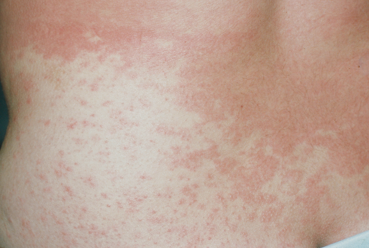 Il s'agit d’une éruption urticarienne dans le cadre d’une hypersensibilité à un médicament. Si les éruptions urticariennes et les exanthèmes sont les principales manifestations, il existe beaucoup d’autres présentations cliniques de l’hypersensibilité aux médicaments. Le terme d’hypersensibilité aux médicaments recouvre l’ensemble des réactions cutanées et/ou systémiques induites par la prise d’un médicament, qu’elles soient allergiques ou non. Il s’agit d’un motif de consultation fréquent en médecine générale, que ce soit le cas d’un patient qui appelle pour une urticaire généralisée avec œdème du visage à la suite de la prise d’amoxicilline ou, cas encore trop fréquent, du carnet de santé d’un enfant ou du dossier clinique d’un patient adulte où est noté "allergie à l’iode, à l’aspirine et à la pénicilline". L’hypersensibilité aux médicaments est fréquente mais exceptionnellement sévère et elle n’est allergique que dans 10 % des cas. C’est la raison pour laquelle devant une réaction d’allure allergique à un médicament il ne faut pas porter le diagnostic d’ "allergie" (qui fait peur aux patients et aux médecins) mais celui d’ "hypersensibilité". C’est bien le terme "hypersensibilité à…" qu’il faut noter sur le carnet de santé et dans le dossier et pas "allergie à…". Pour en savoir plus :- Nicolas JF, Vial T, Dubois JP. Hypersensibilité aux médicaments. Rev Prat 2015;65(1):967-8. - Amsler E, Aractingi S, Soria A. Hypersensibilités et allergies. Rev Prat 2015;65(1):121-38