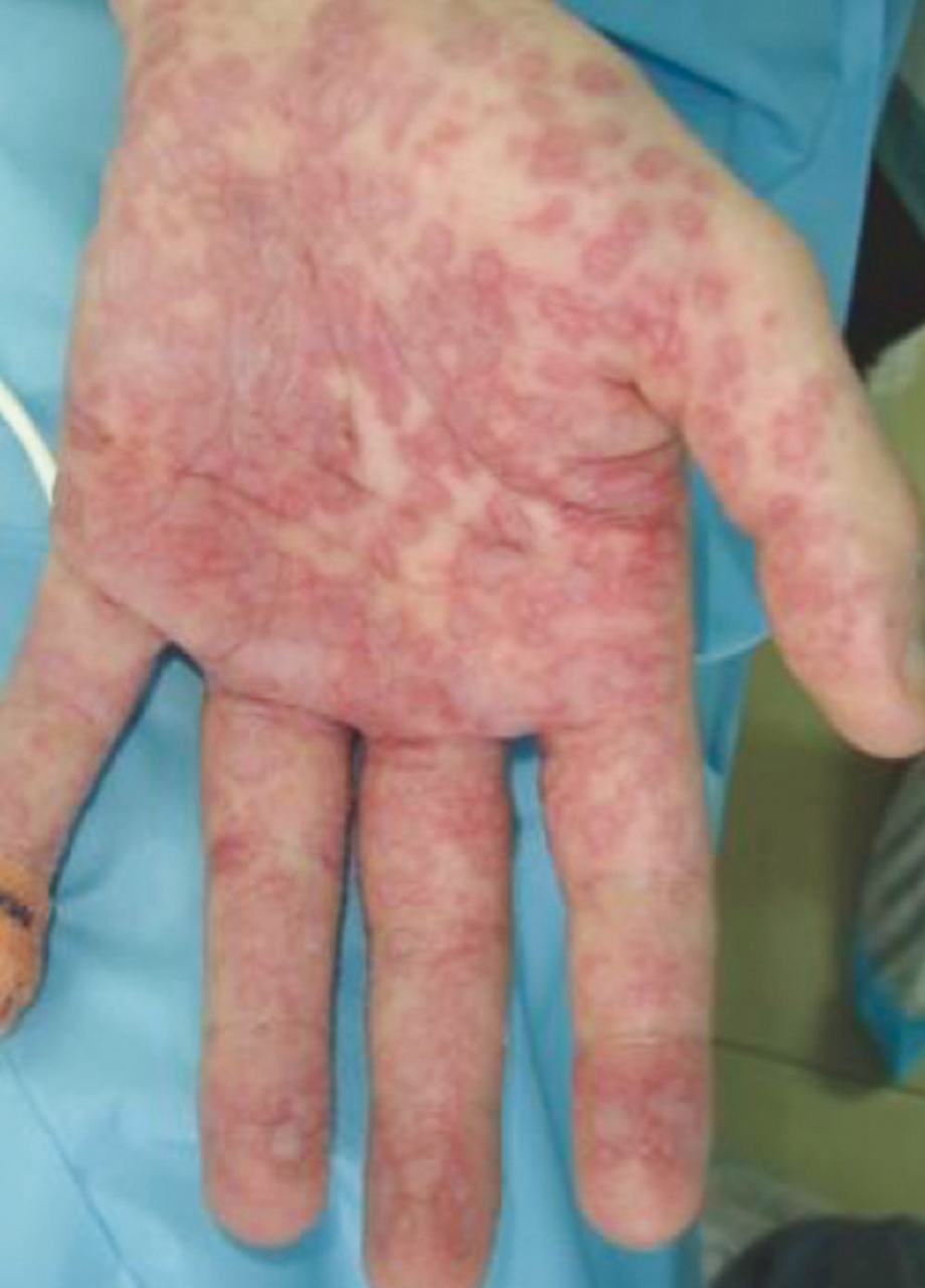 Il s'agit de l'aspect clinique d'un érythème polymorphe majeur. Les toxidermies sévères constituent un spectre de 7 maladies reconnues par la Haute Autorité de santé (HAS) dans le plan maladies rares sous l'acronyme DBT (dermatoses bulleuses toxiques) : nécrolyse épidermique toxique, regroupant les syndromes de Lyell et de Stevens-Johnson ; DRESS syndrome ; pustulose exanthématique aiguë généralisée ; érythème pigmenté fixe généralisé ; érythème polymorphe majeur ; dermatose à IgA linéaire ; autres toxidermies érythémateuses sévères ne répondant pas aux critères diagnostiques d'entité spécifique des 6 autres maladies. Dans le but d'améliorer la prise en charge des toxidermies sévères, une organisation en réseau de soins a été préconisée par la HAS. Ainsi un centre de référence national des dermatoses bulleuses immunologiques et toxiques a été labellisé à l'hôpital Henri-Mondor (Créteil) en 2005 et 7 centres de compétences régionaux ont été créés en 2009.