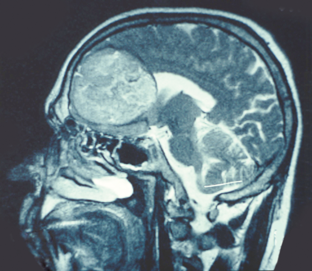 Il s'agit de l’aspect IRM en coupe sagittale d’un oligodendrogliome. Les gliomes sont les tumeurs les plus fréquentes du système nerveux central. Les gliomes sont classés en fonction des types cellulaires dont on suppose qu’ils sont issus : les astrocytes et les oligodendrocytes. Les manifestations cliniques inaugurales des tumeurs cérébrales sont dues à leur croissance et résultent de mécanismes différents pouvant coexister selon la nature, la localisation et la vitesse de croissance de la tumeur ainsi que la capacité à générer un œdème péritumoral et une hémorragie intratumorale. Alors que les tumeurs "bénignes", quand elles sont corticales, sont souvent révélées par une épilepsie ou de découverte fortuite, l’apparition d’un déficit doit faire craindre une transformation anaplasique.