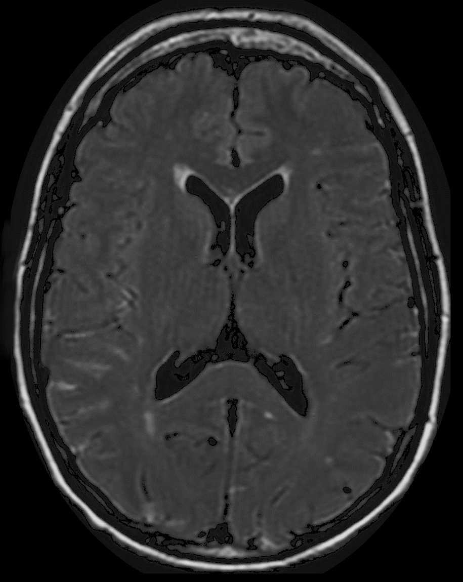 Il s'agit d’une IRM cérébrale en séquence FLAIR montrant des hypersignaux linéaires des espaces sousarachnoïdiens (flèches), l’hyperdensité de ces espaces signant l’hémorragie méningée. L’imagerie cérébrale occupe une place centrale dans le diagnostic initial, le suivi et le traitement des patients atteints d’hémorragie méningée. Un scanner doit être réalisé en urgence, il démontre une hyperdensité des espaces sousarachnoïdiens, évalue la sévérité par l’échelle de Fisher et recherche les complications précoces. Si l’IRM est accessible et que l’état du patient est compatible, les séquences FLAIR, T2* ou imagerie pondérée en susceptibilité magnétique (SWI) peuvent remplacer le scanner cérébral sans injection, avec une sensibilité plus élevée pour le diagnostic d’hémorragie méningée.