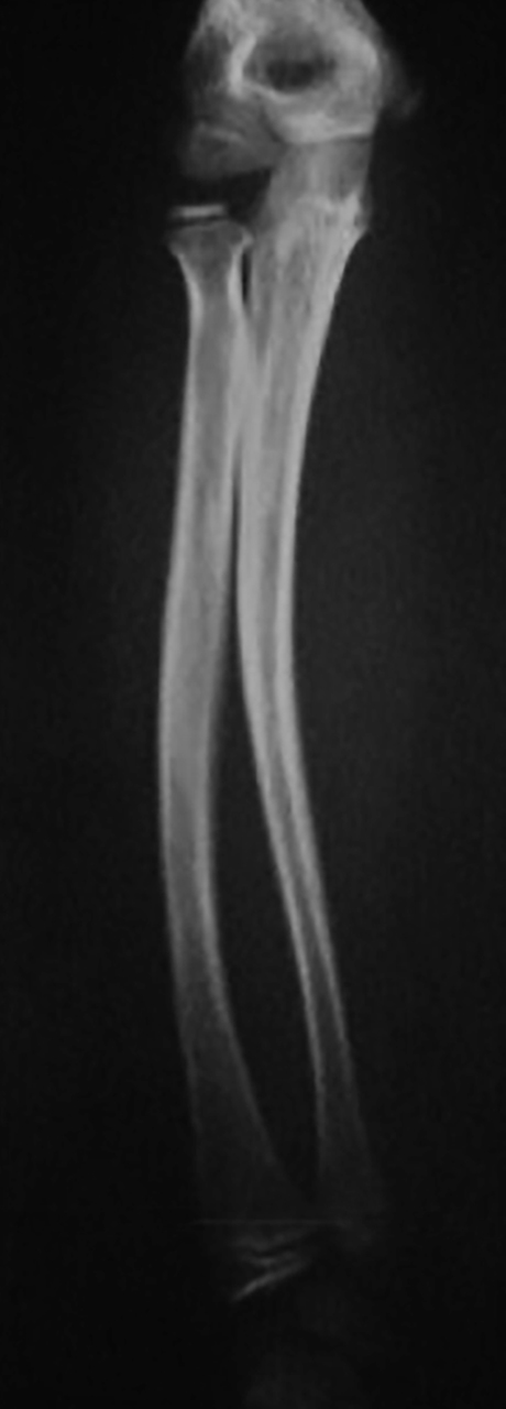 Il s'agit de l'aspect radiologique d'une fracture plastique chez l'enfant. Si certaines fractures sont proches de celles rencontrées chez l'adulte, d'autres sont en revanche spécifiques à l'enfant : fractures en motte de beurre, fractures en bois vert, déformation plastique, fractures sous-périostées, décollements épiphysaires. L'os de l'enfant est moins résistant que celui de l'adulte mais il n'y a pas de fracture sans traumatisme, donc pas de fracture avant l'âge de la marche. Le bilan radiographique comprend des clichés avec des incidences de face et de profil, englobant les articulations sus- et sous-jacentes. Les clichés comparatifs ne sont pas nécessaires. Ces clichés sont réalisés après antalgie efficace (paracétamol et anti-inflammatoires non stéroïdiens). La fracture plastique est une incurvation pathologique de la diaphyse, sans rupture corticale, qui survient lorsque les capacités élastiques de l'os sont dépassées. L'ulna et la fibula sont les os les plus souvent concernés. Le traitement est orthopédique, par une immobilisation plâtrée pour une durée de 3 semaines. La radiographie de contrôle n'est pas systématique.