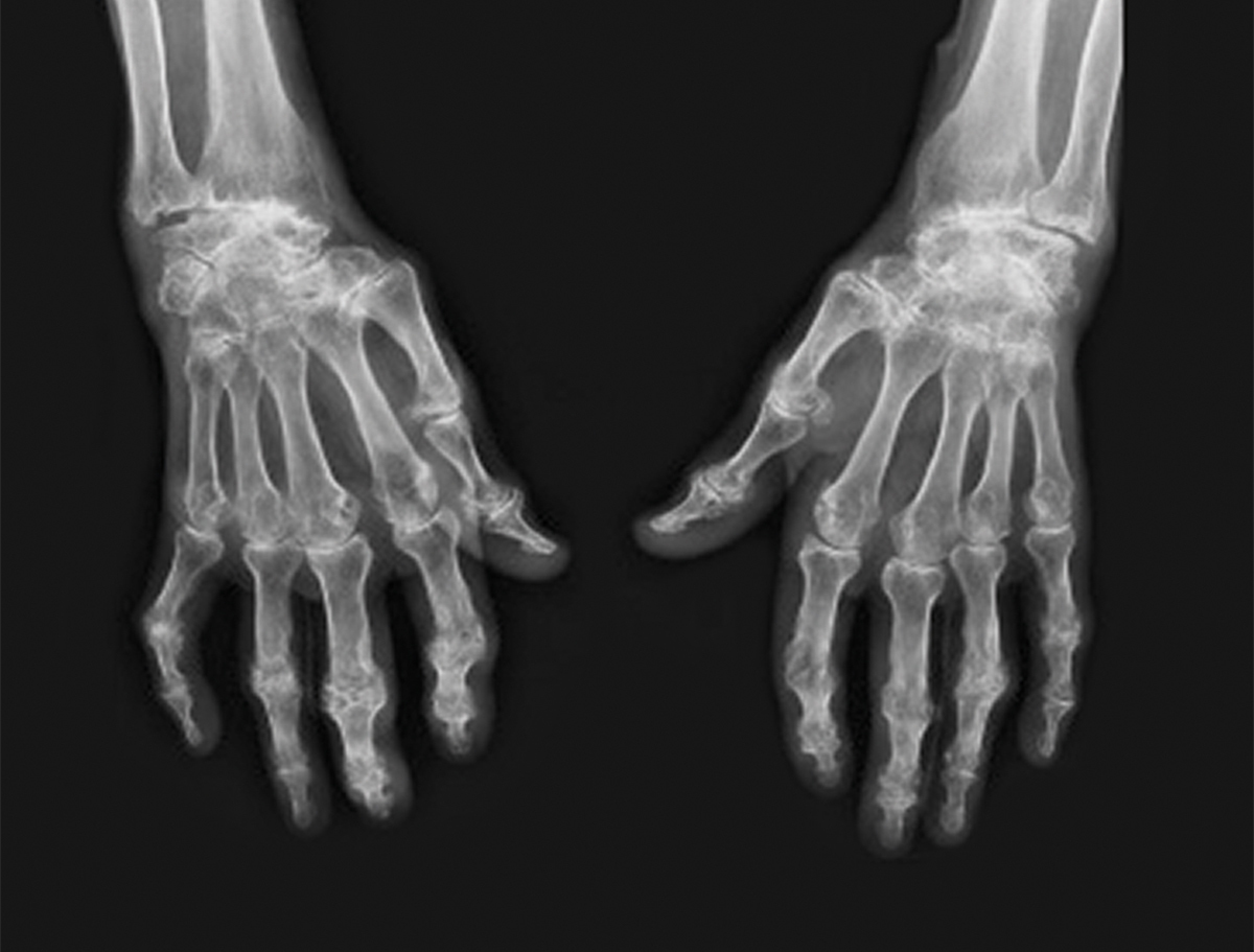 Il s'agit de l'aspect radiologique d'une polyarthrite rhumatoïde. Cette patiente a une polyarthrite rhumatoïde érosive très évoluée : carpite fusionnante des deux poignets, érosions bilatérales de la styloïde cubitale, arthrite radio-ulnaire distale gauche, érosion des têtes métacarpiennes des 1er et 2e rayons de la main gauche ainsi que des 1er, 2e et 3e rayons de la main droite, pincement des interlignes interphalangiens proximaux aux deux mains réalisant de véritables ankyloses au niveau des 2e et 3e rayons de la main gauche.