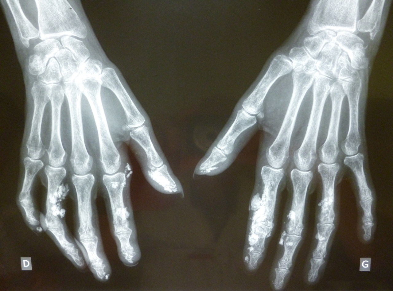 Quel est votre diagnostic ? Calciphylaxie Sclérodermie Dermatomyosite Calcifications post-infiltrations de corticoïdes Granulomes sarcoïdosiques calcifiés OK Pour en savoir plus : Legendre P, Mouthon L. Sclérodermie systémique. Rev Prat 2017;67(7). Valider mes réponses